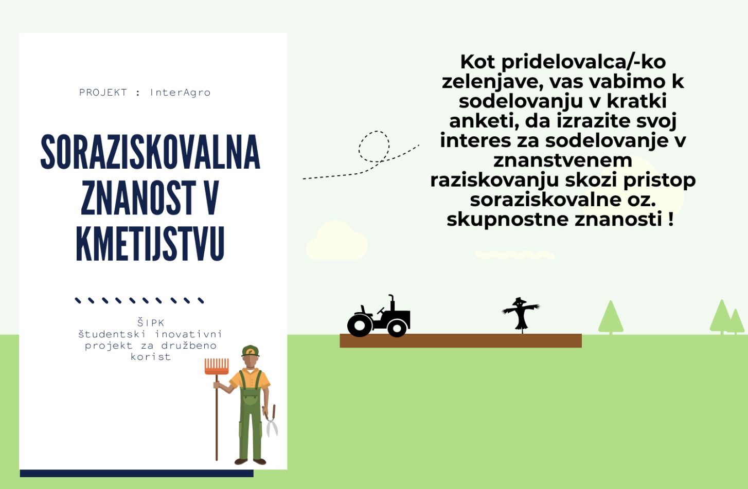 Soraziskovalni projekti predstavljajo novo prakso v znanosti, v katerih poteka aktivno sodelovanje raziskovalcev s strokovno in splošno zainteresirano javnostjo, s t.i. soraziskovalci. Ti so aktivno vključeni v raziskovalne naloge, kot je opazovanje pojavov, zbiranje podatkov, v določenih primerih pa tudi analiza podatkov in oblikovanje izsledkov. Z anketo želimo pridobiti informacije o interesu pridelovalcev zelenjave v Sloveniji po vključevanju v soraziskovalne projekte.